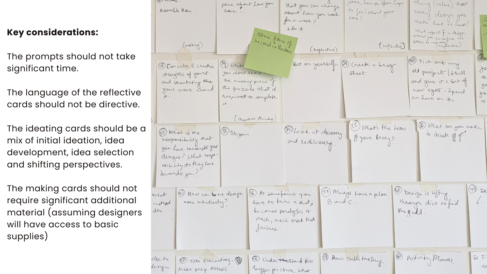 The ideating cards should be a mix of initial ideation, idea development, idea selection and shifting perspectives.