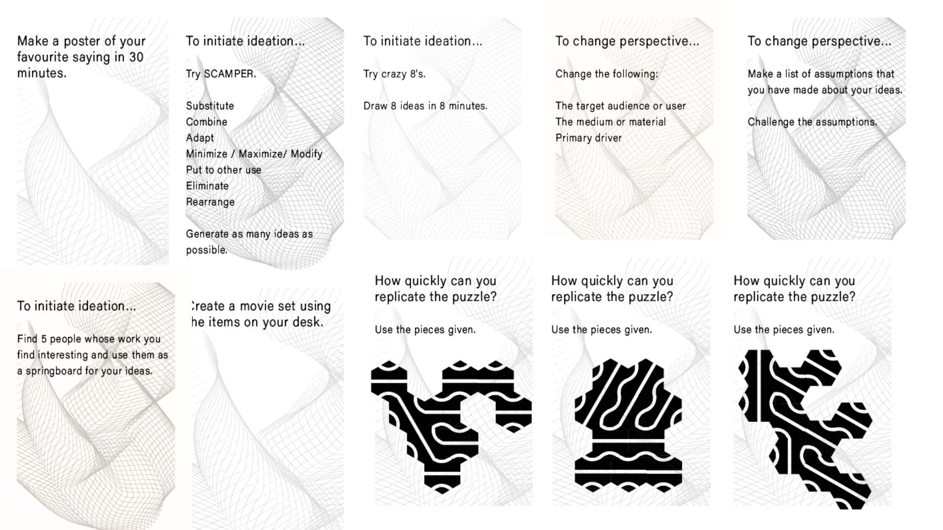 This kit has been desgined to help designers explore and sustain their creative states. It can be used to delve deeper into creative tendencies, see designs from a new perspective, inspire new ideas or just just creative juices flowing.